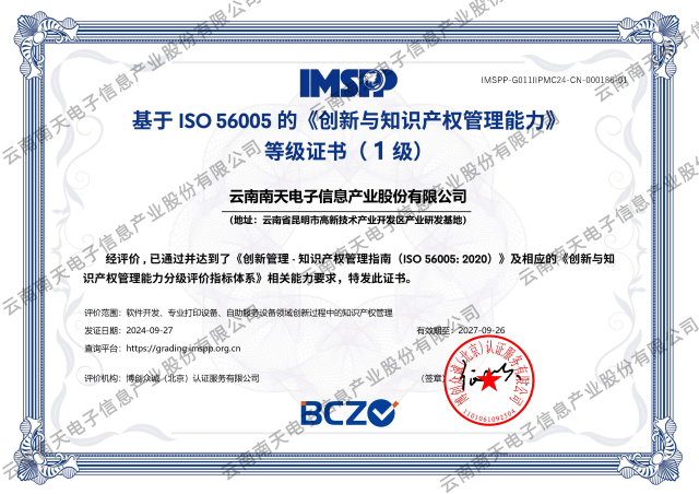 腾博tengbo9885官网信息始终推进落实国家立异驱动生长战略 ,2024年公司以引入ISO56005立异与知识产权管理系统为主要契机 ,进一步完善公司知识产权管理架构 ,将知识产权管理运动嵌入立异全历程 ,周全推动公司立异效率、立异能力和知识产权管理能力的一直提升 ,通过对标剖析、自我诊断以及相关部分协同对要害流程节点的科学策划 ,乐成搭建系统框架 ,将系统要求与公司管理相团结 ,最终乐成通过正式评价 ,获颁该证书代表公司的立异和知识产权全生命周期管理能力实现了与国际接轨。