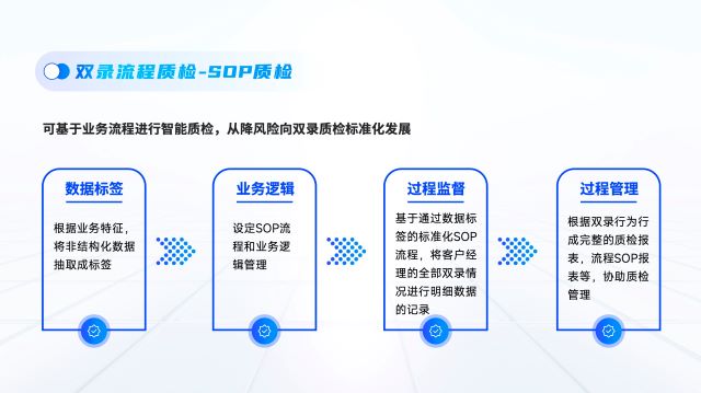 该平台定制双录营业标准SOP质检流程,无邪设置全场景营业流程(包括产品购置规则、中保信质检对接、智能话术流程、营业订单比对等),适配差别的营业规则  ;对全历程举行实时监视与管理,实时天生质检报告,大幅提升营业打点效率及客户体验  ;建设双录后台管理、智能审核系统及数据清静防护,统一管理双录订单,打造全栈式双录中台,实现了双录营业打点流程以及历程监视的全自动化执行,既切合羁系要求,又知足营业需求 。